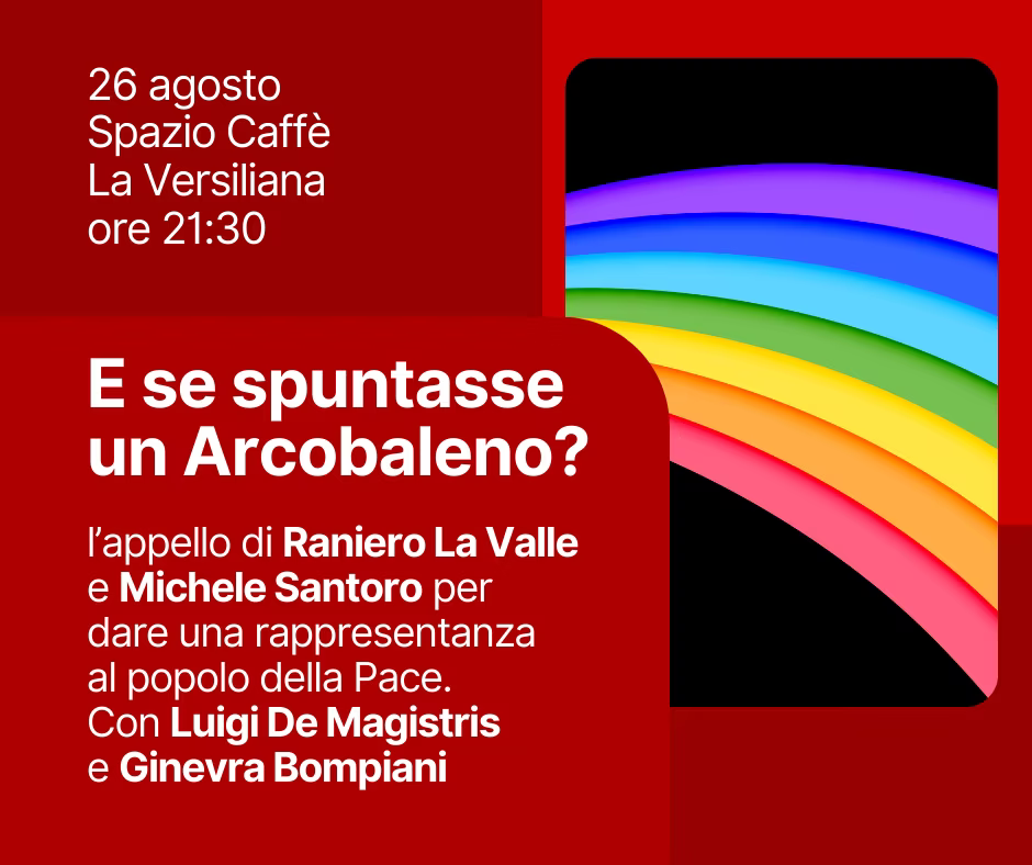 Perché questa prospettiva alternativa sia assunta, e diventi programma e oggetto di lotta politica, il 26 agosto alla Versiliana, a Marina di Pietrasanta, sarà lanciato un appello per dar vita a un’ “assemblea permanente” che “prenda partito” per la Pace, per la salvezza della Terra e per l’affermazione della Dignità di tutte le creature, iniziativa di cui si dovrà poi discutere per giungere a fine settembre alle opportune decisioni operative. Tra i promotori Michele Santoro e Raniero La Valle.