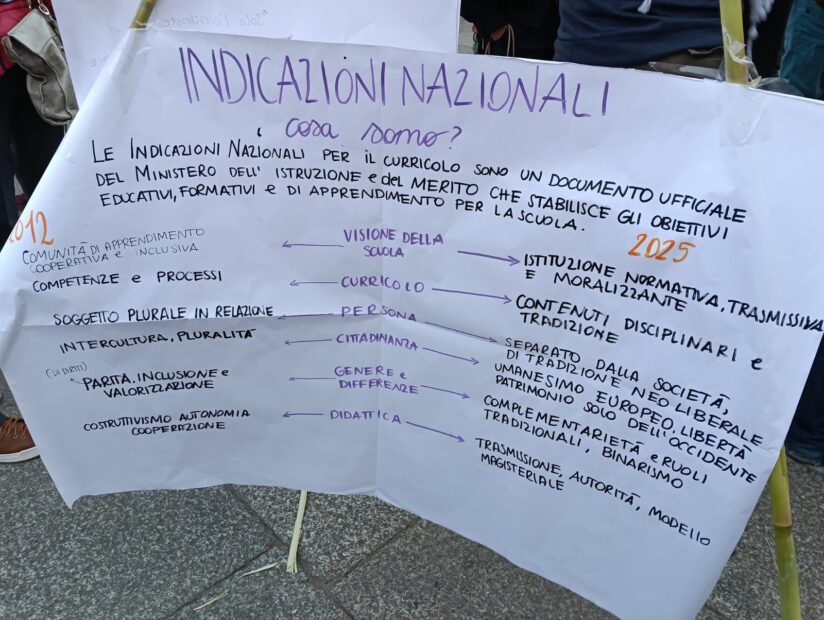 È una lotta di lunga lena quella iniziata sabato 18 ottobre in trenta piazze d’Italia, promosse dal tavolo nazionale per la scuola democratica, per contrastare la deriva retrograda e oscurantista delle indicazioni didattiche, per la scuola primaria, concepite dal laboratorio regressivo del ministro Valditara.