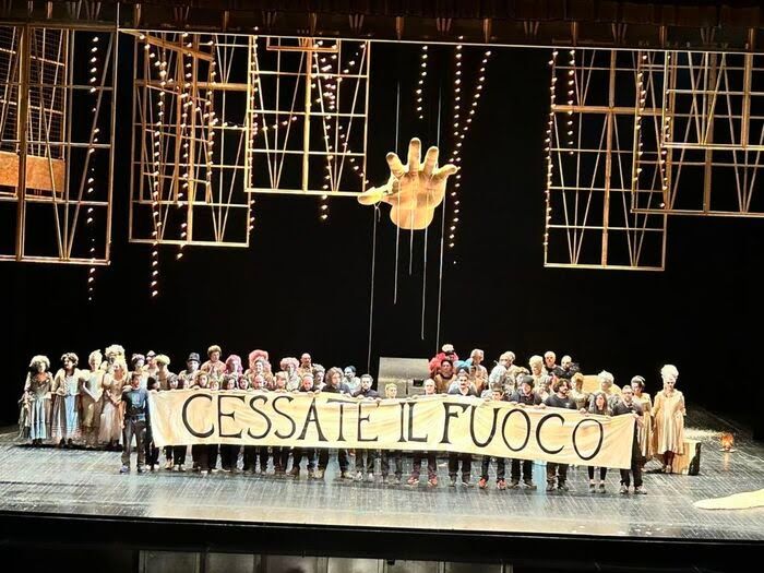 Recentemente e nei giorni scorsi al Teatro Regio di Parma, al Teatro Lirico di Cagliari, al Teatro alla Scala di Milano e in altri teatri d’Italia sono stati esposti striscioni con la scritta disperata e dissacrante “CESSATE IL FUOCO“ e si è apertamente urlato all'unisono da parte degli artisti e attivisti organizzatori il motto “Palestina libera” e “non in nostro nome”.