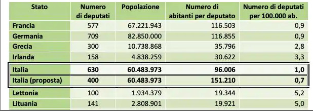 Il primo argomento a sostegno della proposta di riforma verte su un assunto: 945 parlamentari (più i senatori a vita) sono “troppi”. I numeri però sembrano indicare una cosa diversa, dal momento che, in rapporto alla popolazione, abbiamo un deputato ogni 96mila abitanti e un senatore ogni 192mila. Come spiega un report del Centro Studi del Senato, si tratta di un tentativo portato avanti con alterne fortune da anni, e anche nella diciassettesima legislatura la questione era stata affrontata più o meno allo stesso modo. Nella relazione che accompagnava la proposta di modifica, "si proponeva di passare dall’attuale criterio di un deputato ogni 95.000 abitanti ad un parametro più in linea con gli standard europei: un deputato ogni 125.000 abitanti. Ne sarebbe derivato un numero complessivo di 480 deputati. Per i senatori, si proponeva un numero complessivo di 120, ripartiti in proporzione al numero di abitanti in ciascuna Regione". Successivamente, la Commissione per le riforme costituzionali, istituita dall’allora Presidente del Consiglio l’11 giugno 2013, invece, nel corso di un articolato lavoro che comprendeva anche la forma di governo, gli istituti di partecipazione popolare e il superamento del bicameralismo paritario, propose una Camera di 450 deputati e un Senato tra i 150 e i 200 membri. Il Parlamento, nei mesi successivi, discusse e approvò la riforma Boschi – Renzi, che prevedeva 630 deputati e 100 senatori, nell'ambito della revisione dell'assetto istituzionale e del bipolarismo perfetto: progetto bocciato poi a larga maggioranza dal voto dei cittadini il 4 dicembre del 2016.