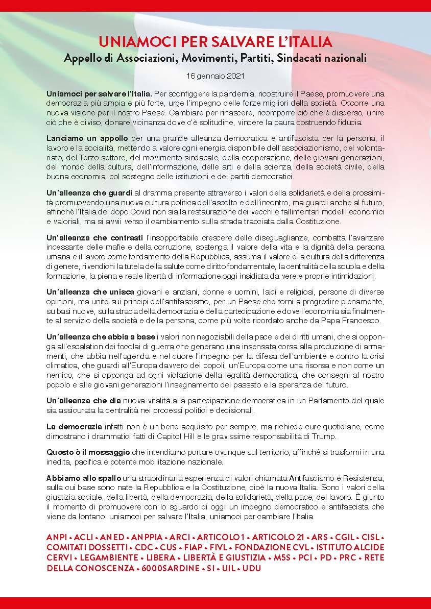 Uniamoci per salvare l'Italia. Per sconfiggere la pandemia, ricostruire il Paese, promuovere una democrazia più ampia e più forte, urge l'impegno delle forze migliori della società. Occorre una nuova visione per il nostro Paese. Cambiare per rinascere, ricomporre ciò che è disperso, unire ciò che è diviso, donare vicinanza dove c'è solitudine, vincere la paura costruendo fiducia.