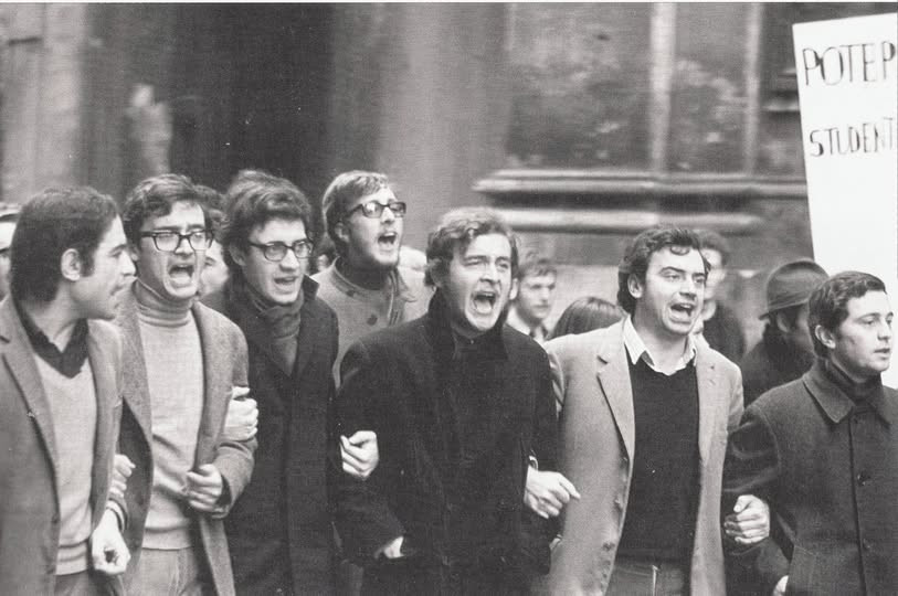 Questa foto è stata scattata il 24 febbraio 1968. Si distinguono fra gli altri Oreste Scalzone che poi fonderà Potere Operaio; Paolo Flores d’Arcais che fonderà Micromega; Massimiliano Fuksas, allievo di Bruno Zevi e uno dei più famosi architetti e designer italiani. Una settimana dopo questo scatto sarà il 1 marzo, il giorno della cosiddetta “battaglia” di Valle Giulia, che cambiò le regole dello scontro politico.