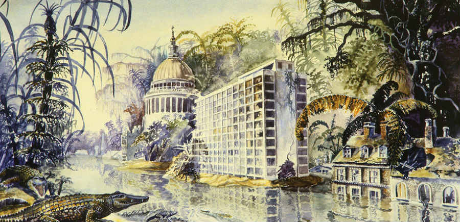 Nel primo siamo a Londra, ma una Londra irriconoscibile, che per l’innalzarsi del livello degli oceani e dei mari è divenuta una sorta di Venezia da incubo: la zona è una immensa palude zeppa di coccodrilli famelici e infestata da insetti enormi. Le strade sono diventati canali e i palazzi e i monumenti sono coperti d’acqua. Il protagonista abita negli ultimi piani dell’ Hotel Ritz, i cui primi piani sono immersi nella palude, circondata da una giungla impenetrabile, ma a parte lui il posto è praticamente disabitato. I pochi uomini rimasti sulla Terra vivono al Polo Nord, dove cercano di resistere e di salvare quella civiltà che ormai è destinata alla scomparsa. Ma non c’è rimedio, né redenzione: nessun happy ending nei libri di Ballard: l’Umanità paga il prezzo della sua stupidità, della sua avidità, del suo ottuso e miope egoismo. E’ destinata a scomparire, come in Terra bruciata, dove la situazione descritta è opposta a quella di Deserto d’acqua: sulla terra non c’è più acqua, perché non piove più da tempo: gli oceani non evaporano più e dunque non si formano nubi e non evaporano perché la plastica ha formato una pellicola sul pelo dell’acqua, che non si può rimuovere: è diventata un tutt’uno con l’acqua. L’orribile morte di sete distrugge tutto, finchè la Terra diventa come Marte: un pianeta morto.
