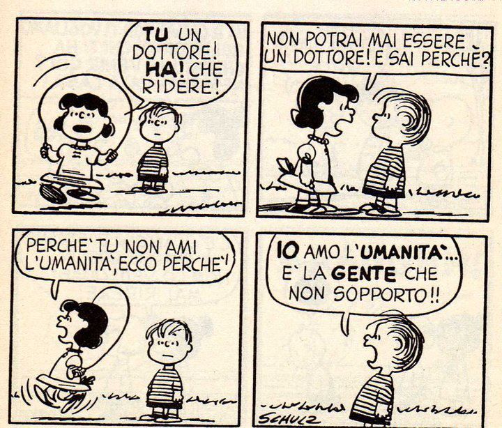 Ma il suo è un disincanto senza cinismo, è realismo, è vita vissuta, è qualcosa che sentiamo anche noi come probabile: “Per farsi un amico ci vuole quasi una vita. Bisogna essere stati poveri insieme e qualche volta felici.” Del resto “È facile amare l'umanità, difficile è amare il prossimo.” Beh, non è il solo a dirlo! Anche il famoso fumettista americano Charles M. Schulz, faceva dire al meraviglioso personaggio Linus dei suoi Peanuts “Io amo l’Umanità è la gente che non sopporto!”
