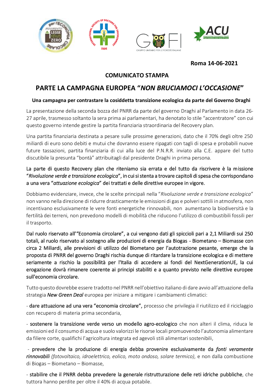 Parte oggi la campagna #nonbruciamociloccasione Recovery Plan Italia vs NextGenerationEU per chiedere alla Commissione Europea e al Parlamento Europeo una revisione del piano presentato dal governo Draghi e attuare così una VERA TRANSIZIONE ECOLOGICA !