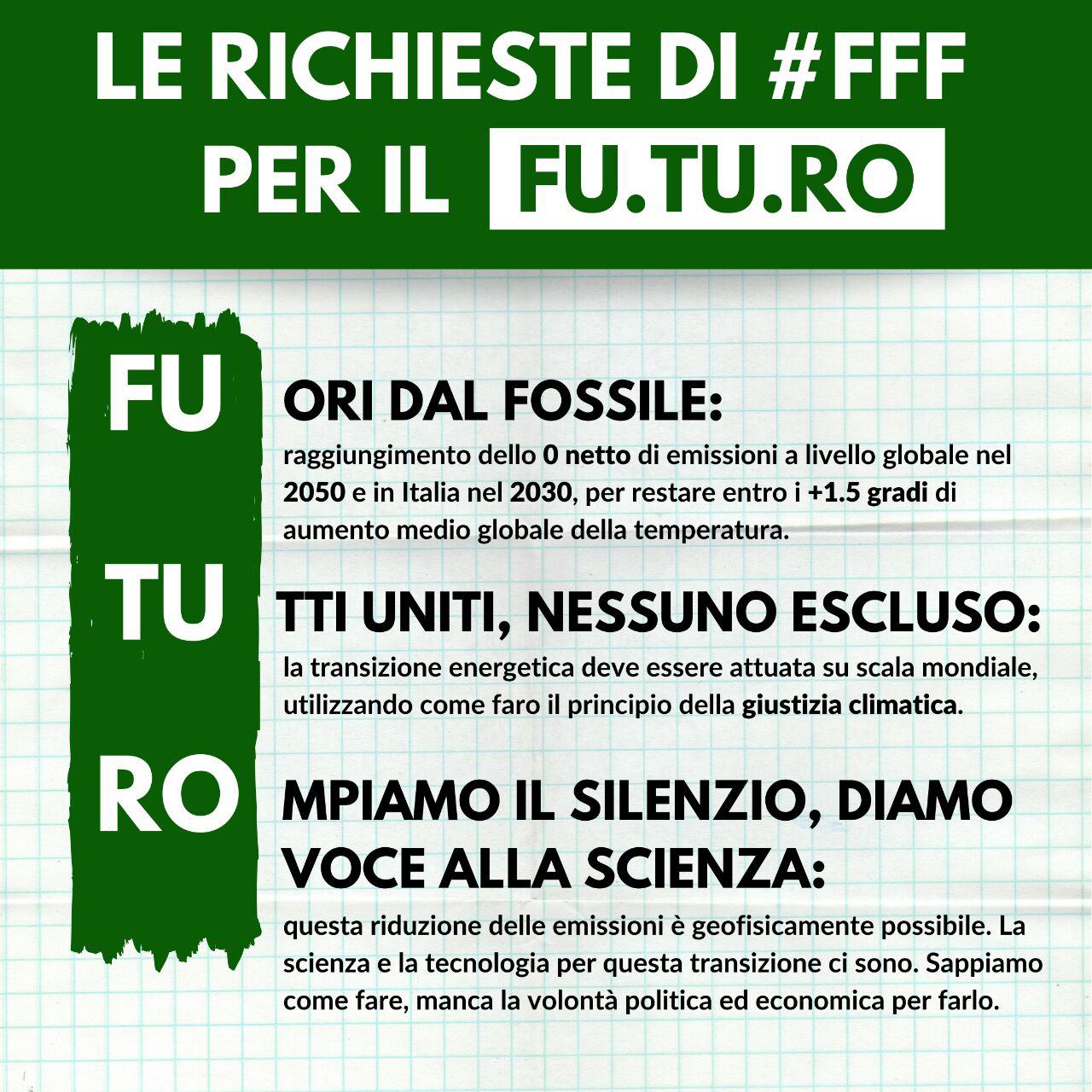 Non vogliamo limitarci a indicare qual è il problema. Ascoltando la voce di migliaia di scienziati che da anni ci avvertono sui rischi che corriamo, dopo lo sciopero di Settembre noi ragazzi e ragazze di #FridaysForFuture abbiamo scritto le nostre richieste per il FU.TU.RO. Tre richieste chiare, brevi, ma rivoluzionarie. Eccole.