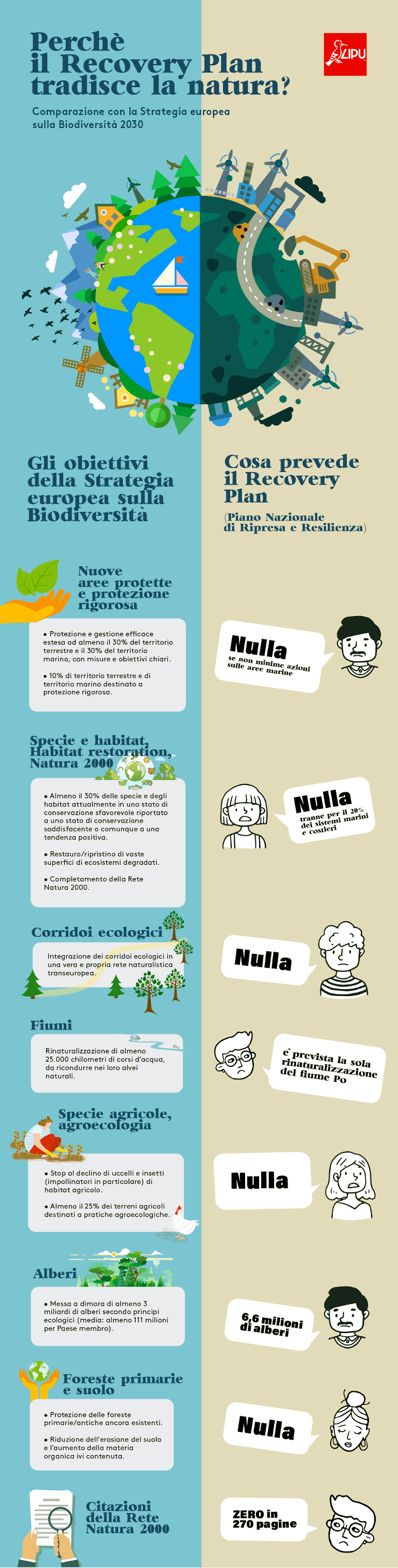 L’infografica qui di seguito compara gli interventi previsti dal Recovery Plan con gli obiettivi della Strategia europea per la Biodiversità. Il rapporto è demoralizzante. L’Italia ha cancellato la natura dai suoi programmi. Rete Natura 2000 non esiste. L’estensione delle aree protette non c’è. Il restauro degli habitat è limitato a un solo genere, pur importante, di intervento (fondali marini). L’agroecologia è una chimera, sostituita dalla tecnoagricoltura. Corridoi ecologici, ripristino delle specie, riduzione del consumo di suolo: zero.