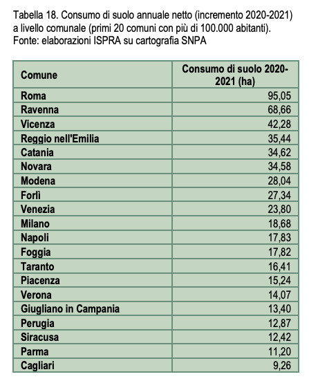 La città di Ravenna è stato il capoluogo più consumatore di suolo dell’intera Regione nello scorso anno (più 69 ettari). E che cosa si fa? Si va avanti. In Regione si consuma perfino nelle aree protette (più 2,1 ettari nel 2020-2021), nelle aree a pericolosità di frana (più 11,8 ettari nel 2020-2021), nelle aree a pericolosità idraulica dove l’Emilia-Romagna vanta un vero e proprio record essendo la prima Regione d’Italia per cementificazione in aree alluvionali: più 78,6 ettari nelle aree ad elevata pericolosità idraulica; più 501,9 in quelle a media pericolosità che è poi più della metà del consumo di suolo nazionale con quel grado di pericolosità idraulica: pazzesco.