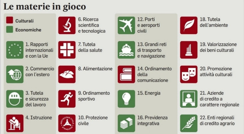 Dunque, nell’anno 2018 ecco i famosi pre-accordi, i preliminari d’intesa sull’autonomia differenziata, tra due regioni a guida leghista, Veneto e Lombardia, e una a guida del centrosinistra, l’Emilia-Romagna. A queste 3 si aggiunge la Toscana che punta all’autonomia energetica, a riprova che esiste un evidente trasversalismo sulla questione. Le 3 Regioni delle pre-intese in virtù degli articoli 116 e 117 hanno chiesto maggiori autonomie su 23 materie (nell’immagine, a cui si aggiunge la materia “organizzazione giustizia di pace”), tra cui alcune fondamentali come la tutela e sicurezza del lavoro, tutela della Salute, Istruzione e grandi reti di trasporto. L’attribuzione di maggiori autonomie, soprattutto nel quadro della Legge Calderoli, potrà infrangere gli ultimi equilibri rimasti a salvaguardia della coesione nazionale e avvantaggiare alcuni territori a danno di altri, aggravando i divari tra le diverse regioni del Paese in quanto al trasferimento delle funzioni è connessa la distribuzione delle risorse pubbliche per il finanziamento di tali funzioni. I livelli essenziali delle prestazioni (LEP) ovvero i servizi e i diritti minimi che devono essere garantiti ai cittadini in tutte le Regioni a fronte del regionalismo differenziato come dettato dall’art. 117, in 20 anni non sono mai stati attuati.