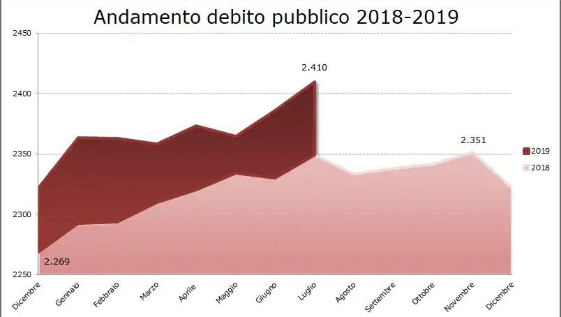 40 mila euro a testa: sarebbe il peso del debito pubblico se fosse suddiviso in parti uguali tra tutti i cittadini italiani. La Banca d’Italia ha reso noto l’ultimo dato sull’indebitamento delle amministrazioni pubbliche: 2.410 miliardi di euro (al 31 luglio 2019). Considerando che gli italiani sono poco più di 60 milioni, mediamente il debito sarebbe, appunto, di 40 mila euro pro capite.