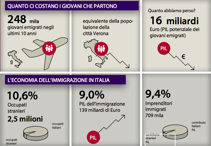 I numeri sono contenuti nel nono “Rapporto annuale sull’economia dell’immigrazione” della Fondazione Leone Moressa, che traccia il bilancio tra entrate e uscite nel nostro Paese. Negli ultimi dieci anni, l’Italia ha perso quasi 500mila individui. Tra questi, 250mila giovani tra i 15 e i 34 anni. Considerando le caratteristiche lavorative di questi giovani – spiegano dalla Fondazione – la stima è che questa “fuga” sia costata 16 miliardi. Se i giovani emigrati restassero in Italia, il valore aggiunto sarebbe quindi di un punto percentuale di Pil.