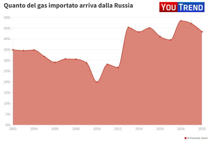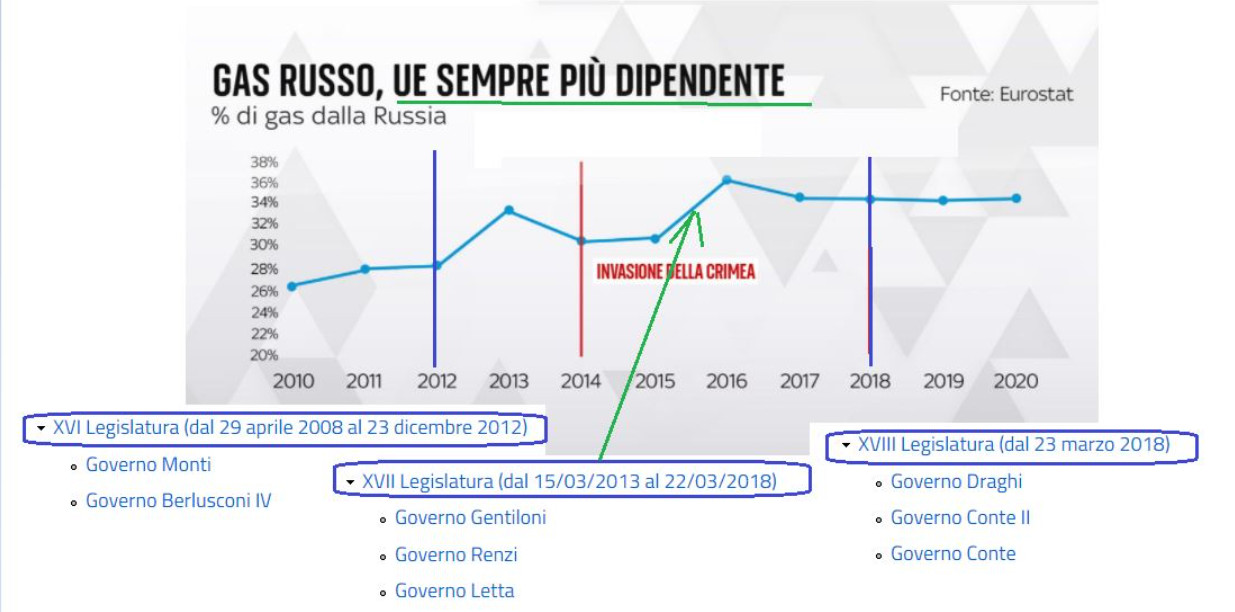 L' andamento negli anni della dipendenza della UE e dell'Italia dal gas russo mostra una impennata che dimostra tutto. L'Italia, a fronte del fabbisogno di energia legato all'essere una delle nazioni con il settore manifatturiero più sviluppato, si presenta pericolosamente esposta, senza una sufficiente copertura di energia rinnovabile, primo intervento che, a qualunque costo, avremmo dovuto vedere.