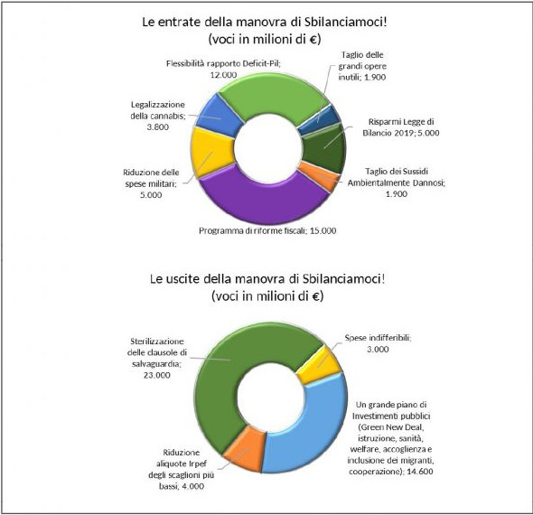 La manovra quindi per Sbilanciamoci! dovrebbe muovere 44,6 miliardi di euro, inclusi i 23 miliardi destinati a sterilizzare anche quest’anno le clausole di salvaguardia e quindi gli aumenti dell’Iva. Resterebbero dunque 14,6 miliardi di euro da destinare al Green New Deal, all’istruzione, alla sanità, alla cultura, all’assistenza delle persone non autosufficienti, all’accoglienza e all’inclusione dei migranti, alla cooperazione internazionale, con 4 miliardi da impiegare in riduzione delle tasse per i primi due scaglioni di reddito e 3 miliardi di spese indifferibili. Si propone tra l’altro di non toccare Quota 100 e il cosiddetto reddito di cittadinanza, che si auspica vengano anzi rifinanziati e migliorati in provvedimenti più organici.