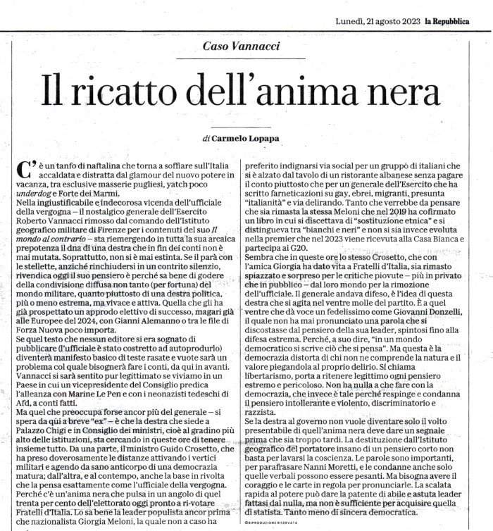Nella ingiustificabile e indecorosa vicenda dell’ufficiale della vergogna — il nostalgico generale dell’Esercito Roberto Vannacci rimosso dal comando dell’Istituto geografico militare di Firenze per i contenuti del suo Il mondo al contrario — sta riemergendo in tutta la sua arcaica prepotenza il dna di una destra che in fin dei conti non è mai mutata.