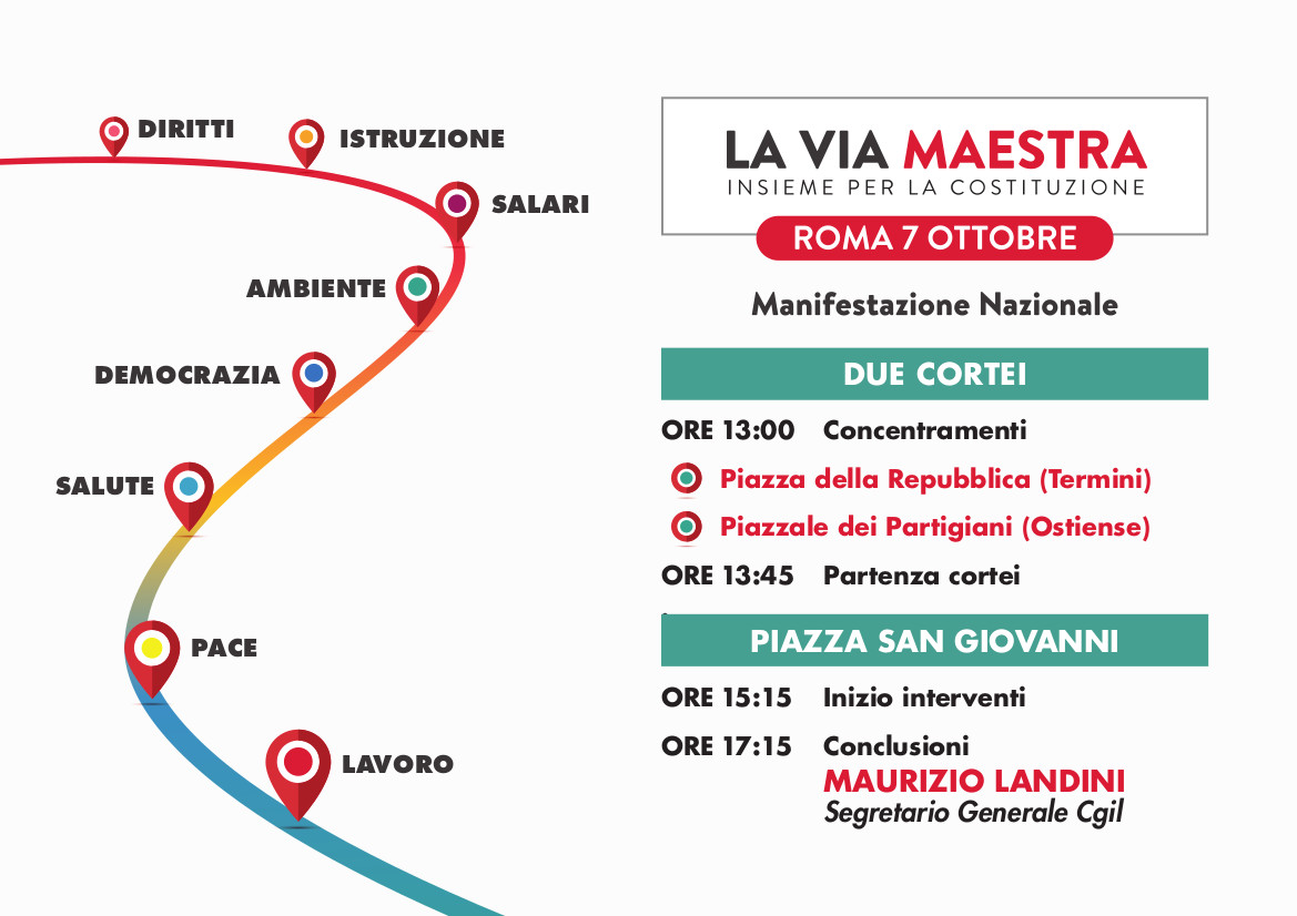 Cosi la CGIL assieme ad altre 100 Associazioni a definito l'elenco dei contenuti in merito alla manifestazione del 7 ottobre che vanno oltre la manifestazione per la pace ed appaiono come un minestrone dove c’è un po’ d tutto, ma non è non una vera piattaforma rivendicativa discussa ed approvata dai lavoratori in assemblea.