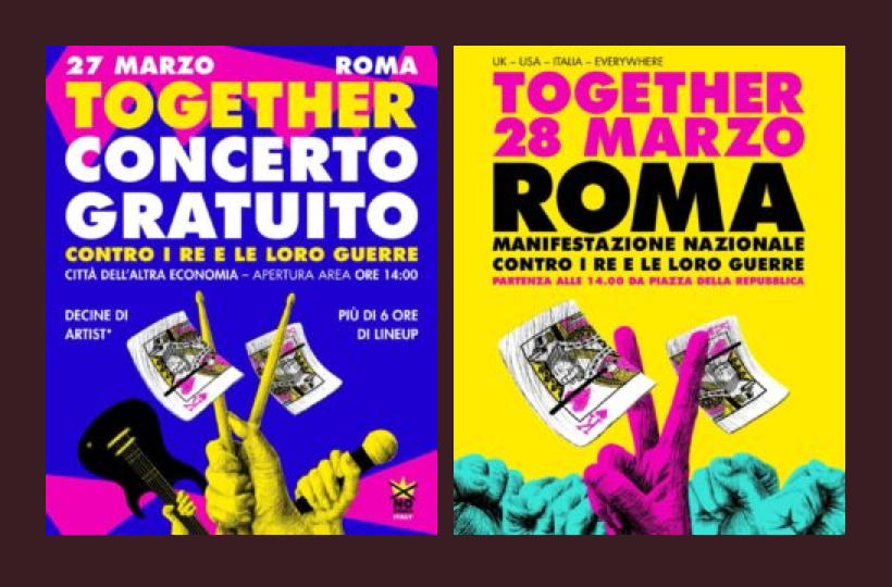 Ai nastri di partenza la due giorni di mobilitazione globale contro i re e le loro guerre indetta dal Movimento No Kings Italia a Roma, il 27 e 28 marzo con un concerto gratuito, venerdì 27 dalle ore 15:30 alla Città dell’Altra Economia, e un corteo nazionale, che partirà alle ore 14 da Piazza della Repubblica e arriverà a Piazza San Giovanni, e per il quale si stanno organizzando centinaia di autobus da tutta Italia. L’iniziativa avrà un respiro internazionale tant’è che si svolgerà in contemporanea con Together, l’evento omonimo lanciato dagli artisti del Regno Unito con un mega-concerto a Londra, e il No Kings Day negli Usa.