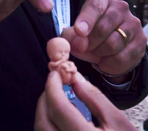 Siamo lontani perfino dall’immagine di famiglia illustrata da Norman Rockwell, così patinata, buonista, così banale, perbene, convenzionale, un tantino ipocrita, eppure così familiare e rassicurante… niente di tutto questo a Verona: basta vedere la scelta kitsch del gadget: un piccolo feto di gomma color carne, un vero orrore sotto ogni punto di vista, con la scritta: "L'aborto ferma un cuore che batte"!