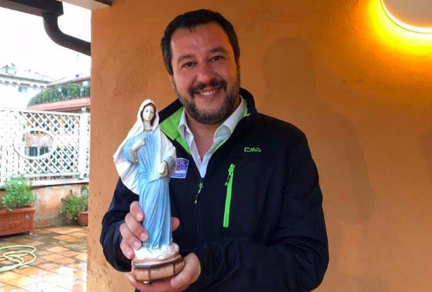 Gli ultimi travestimenti hanno riguardato la religione (rosari e statue della Madonna: una esibizione di fede che, come al solito, è soltanto apparenza, infatti poi lascia morire in mare degli esseri umani, donne e bambini: proprio un bel cristiano! ), ma certamente il camuffamento più inatteso è quello da “intellettuale”.