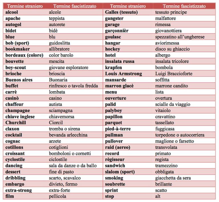 L’adattamento o la sostituzione di parole straniere fu affidato a letterati e linguisti. La sostituzione più famosa è quella ideata da D’Annunzio, che sostituì la parola inglese sandwich con quella italiana tramezzino. Fra i linguisti maggiormente accreditati, Bruno Migliorini, introdusse nella lingua italiana alcune parole destinate a restarci per sempre, come “regista” al posto di “régisseur” e “autista” per “chauffeur”. Per “film” venne adottata la parola “pellicola”, per apache “teppista”, per claxon “tromba o sirena”, “primato” per record, “slancio” per “swing” e negli alberghi i “menu” divennero “liste”.