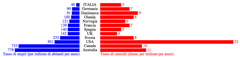 Vediamo un po’ di dati che riguardano il nostro paese, ma non solo. Nel periodo tra il 1 agosto 2020 e il 31 luglio 2021, i femminicidi in Italia sono stati 105: in calo rispetto all'anno precedente ma sempre troppi. Poco meno di uno ogni tre giorni. E ad agosto l'orribile ondata di violenze sulle donne è proseguita arrivando al suo picco il 12: tre crimini nel giro di 24 ore. Due donne sgozzate, una strangolata. Ma non pensiate che queste violenze riguardino solo l’Italia. Guardate questo grafico del 2018 e vedrete che incredibilmente siamo agli ultimi posti e sotto la media europea.