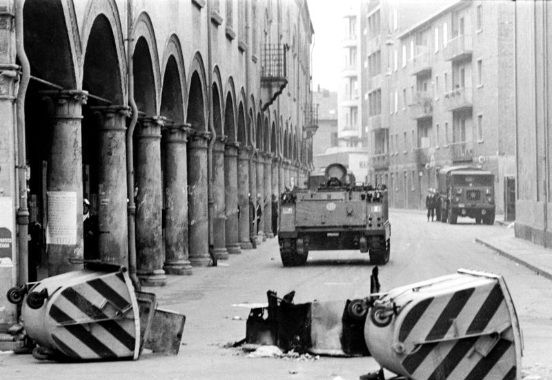 Davanti al crescere degli scontri Cossiga ordina l’invio dei blindati. Qualcuno ha mai visto i carri armati avanzare in città? Io li ho visti venire su da Piazza della Montagnola, lungo Corso Indipendenza. Fanno paura, almeno a me. Ma soprattutto senti lo sconcerto. Non ti immagini nella Repubblica Italiana di vedere l’Esercito contro il Popolo. Non lo credi possibile. Ed invece sono li nel fumo, come grossi scarafaggi verde scuro. Avanzano con un rumore assordante.