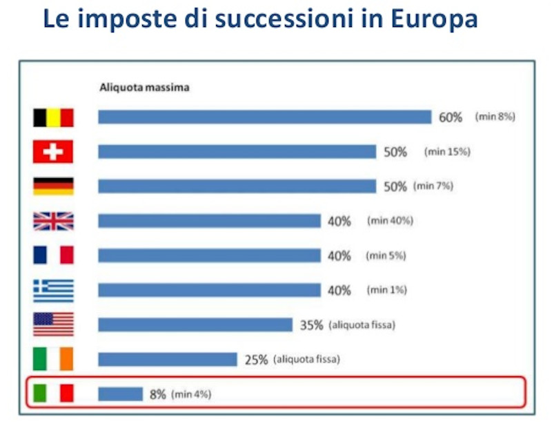Da noi, sulla base di quella Legge (...una delle tante 'ad personam'?), fino a 1 milione di euro coniugi, figli e genitori di chi muore non paga niente...Ed oltre il 4% .