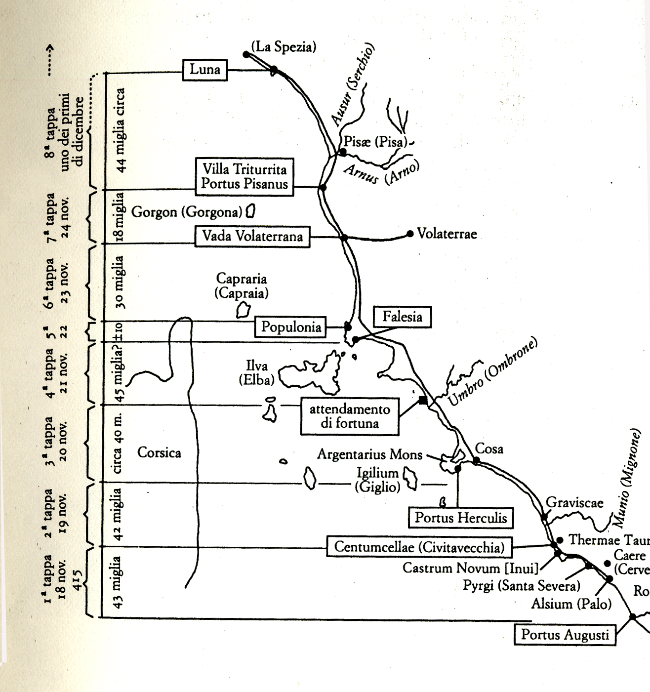 Con dolore si stacca dagli amici e poi comincia il viaggio di ritorno in Gallia: dal porto di Augusto, a Cerveteri, Centocelle, porto Ercole, l’Argentario , l’Elba, Pisa (inimmaginabile senza il suo meraviglioso campo dei miracoli!), e via via fino al confine con la Liguria, dove il testo di Rutilio si interrompe: non perché il viaggio sia finito, ma perché il tempo si è mangiato il resto dell’ opera.